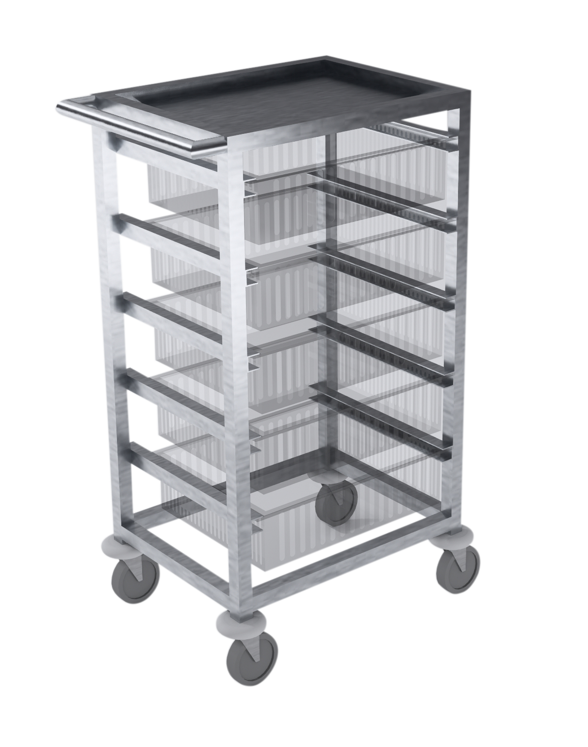 A HTM71 compliant trolley, constructed from stainless steel. Fitted with tray slides allowing the cabinet to use 100mm deep half-size HTM71 modular trays.