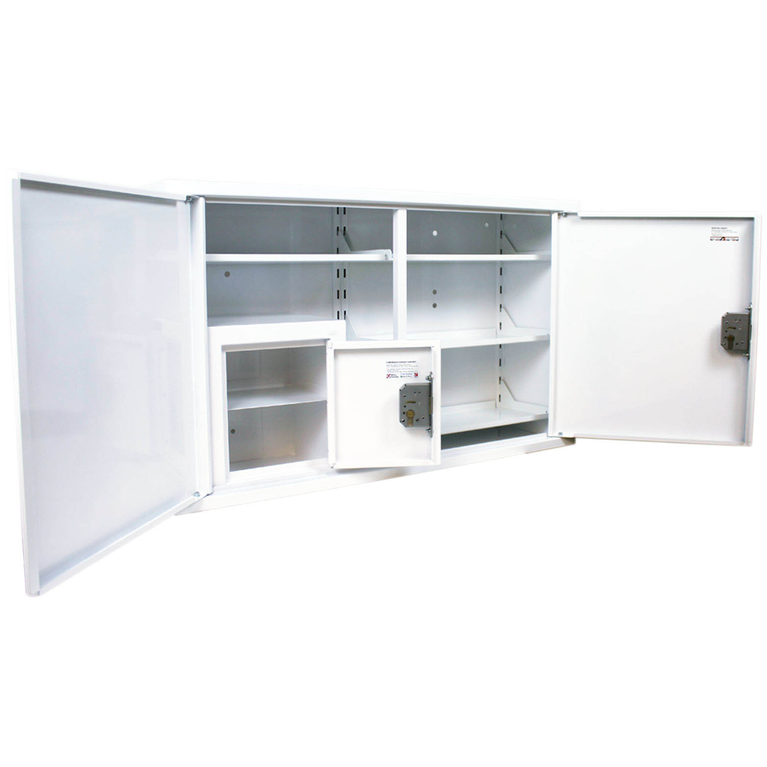 Combined medicine cabinet with inner Controlled Drugs Cabinet for the storage of drugs. BS2881:1989, “Misuse of Drugs (Safe Custody) Regulations and BS3621 compliant.