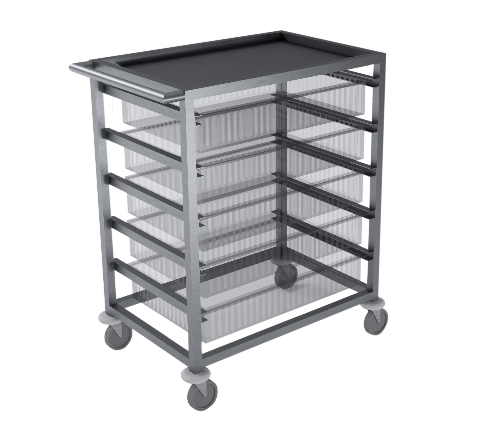 A HTM71 compliant trolley, constructed from stainless steel. Fitted with tray slides allowing the cabinet to use 100mm deep HTM71 modular trays.
